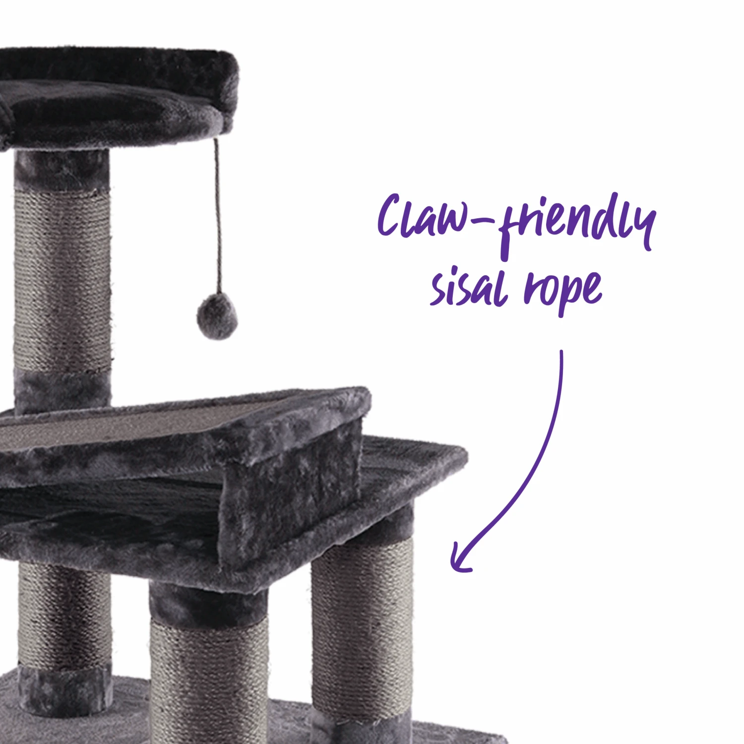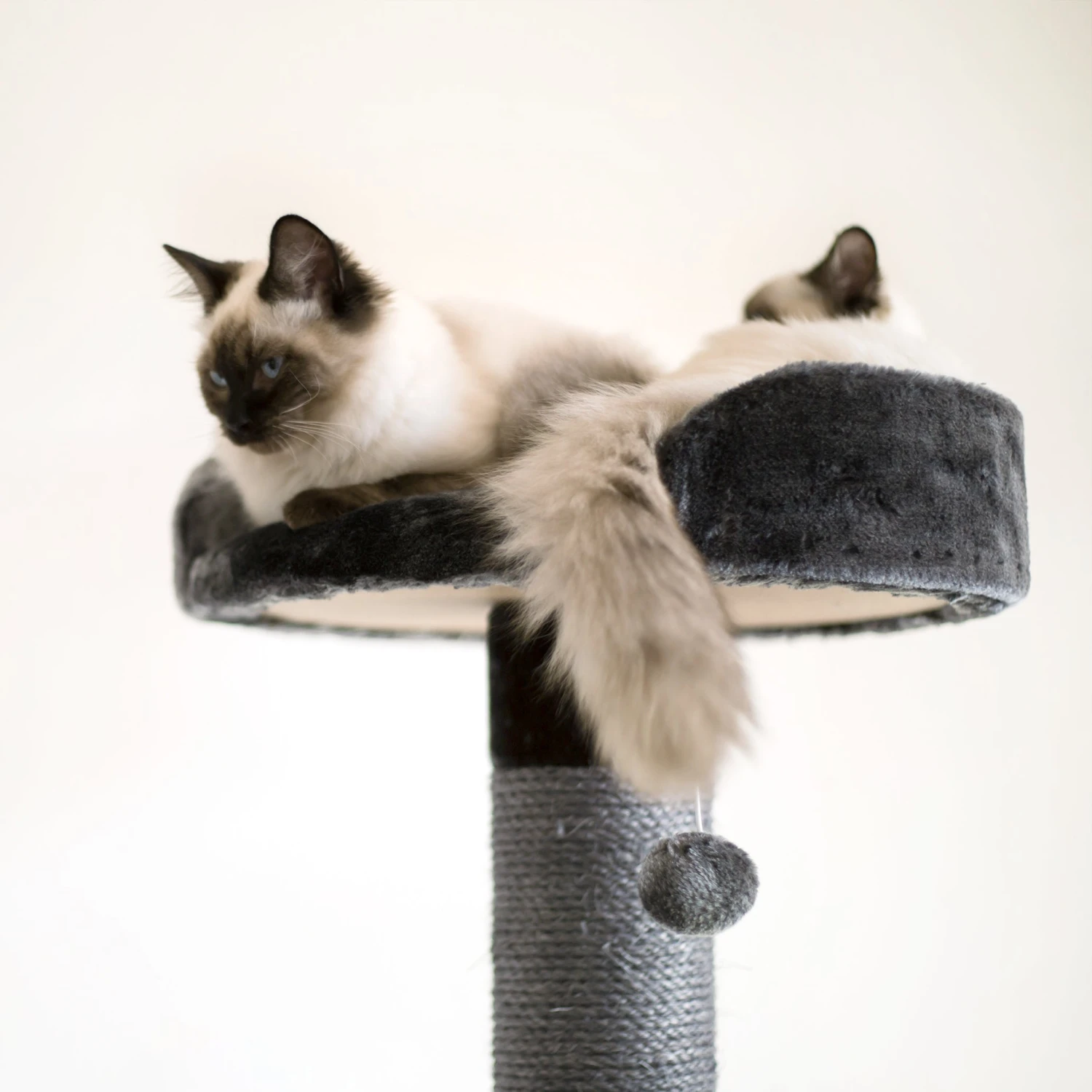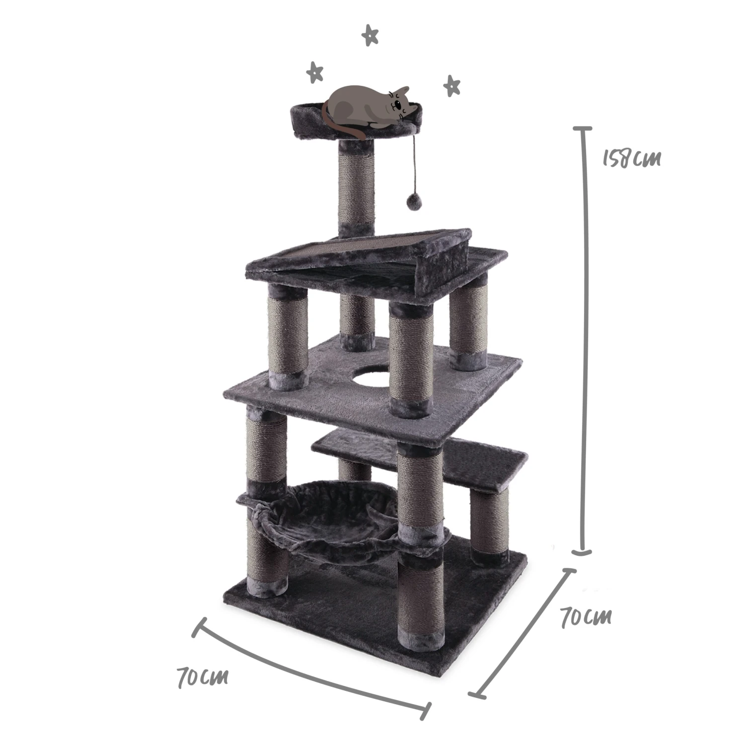 Sisal scratchboards and posts, hanging play ball on a stretch rope, platforms and hideouts, and two separate beds. My favourite one is the one right at the top. Talk about the height of luxury.