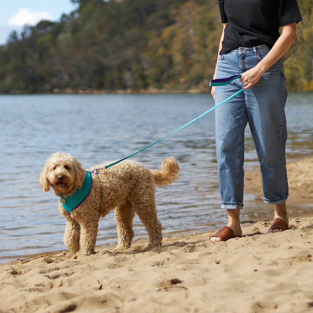 This dapper aqua and purple number is made of high-quality strong nylon and heavy-duty nickel hardware. And because the best kinds of walkies have more adventures than a hooman action movie, my lead is also super strong and comes in two different sizes of length and thickness.