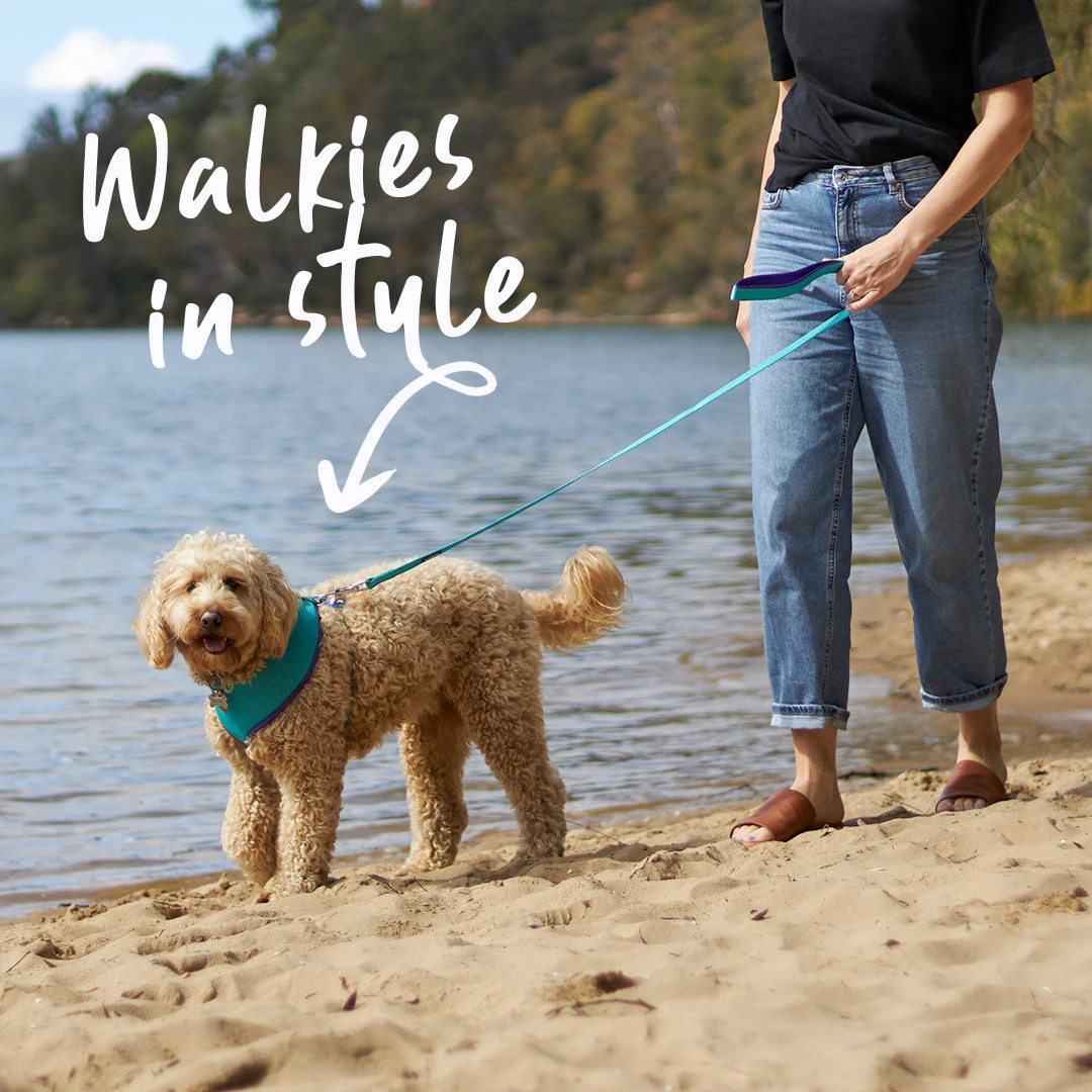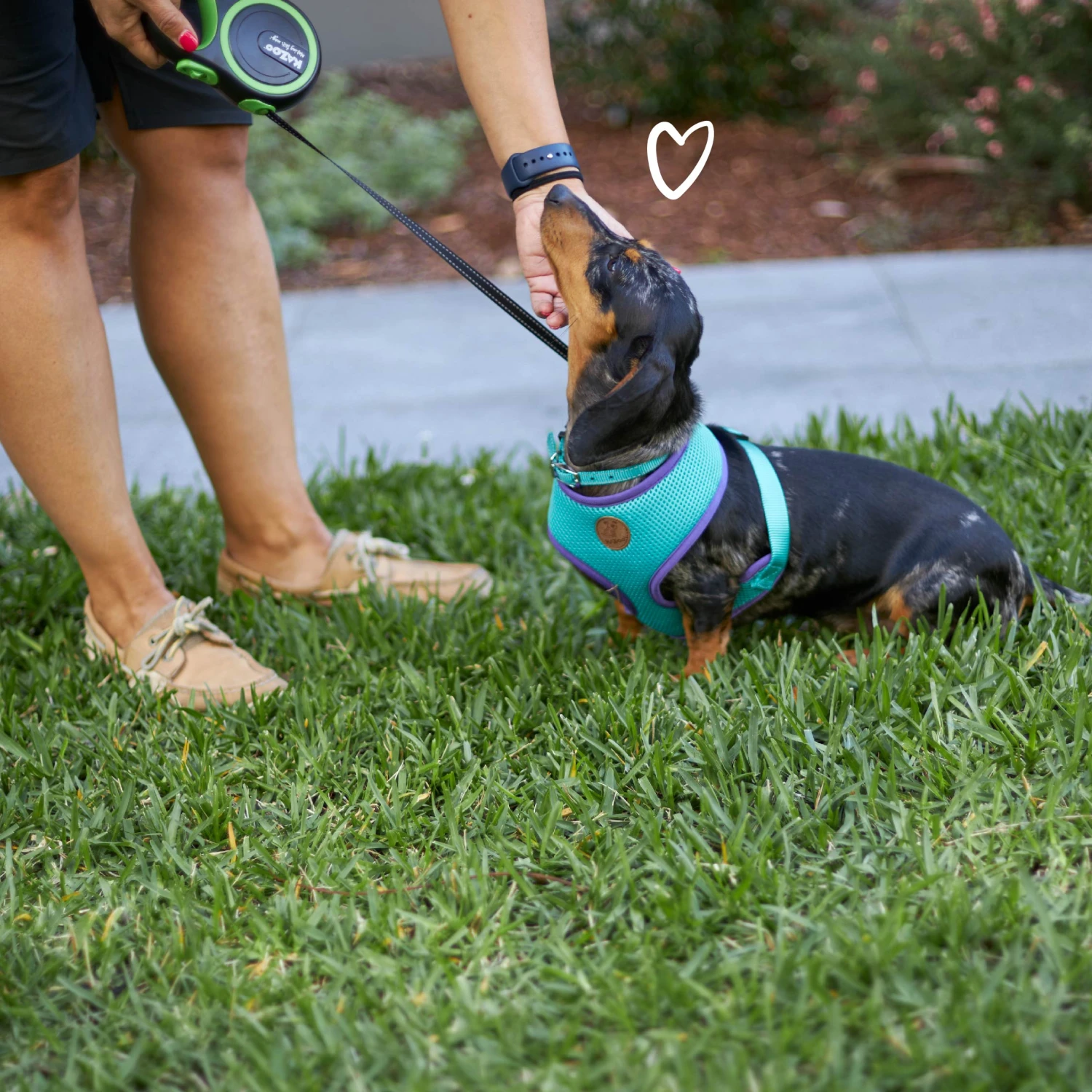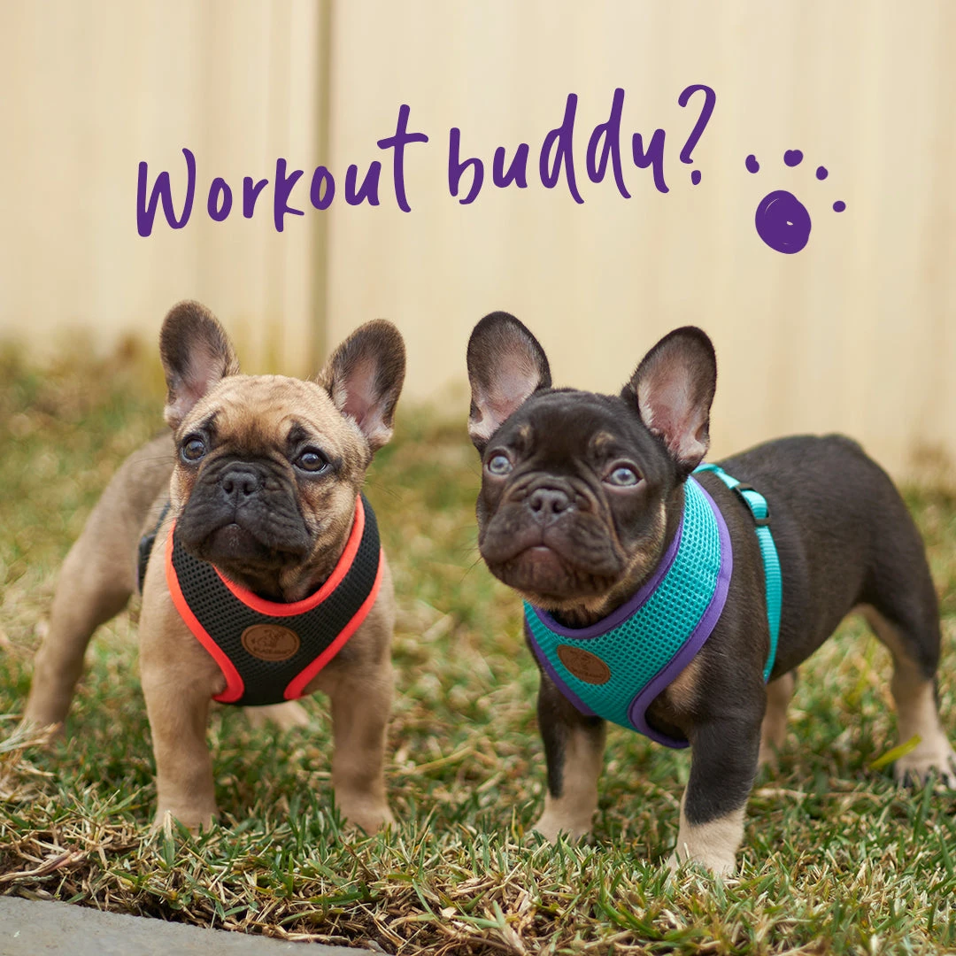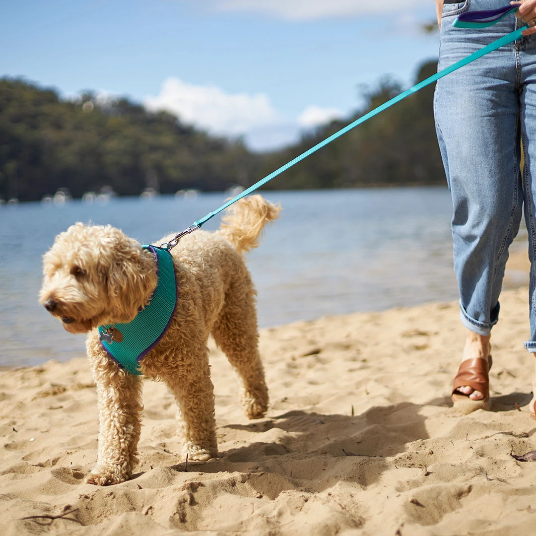 With the breathable air mesh and padded chest on my soft harness, slipping into something more comfortable is as easy as a walk in the park! This soft dog harness is secure whilst staying cool. And if you love to turn heads like me, I’d suggest checking out the matching aqua and purple lead and collar, too.