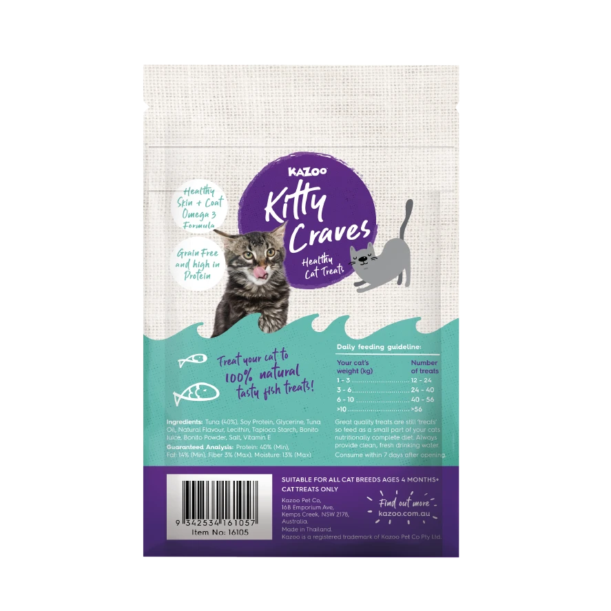 INGREDIENTS: Tuna (40%), soy protein, glycerine, tuna oil, natural flavour, lecithin, tapioca starch, bonito juice, bonito powder, salt, vitamin E. Protein 40%, Fat 14%.