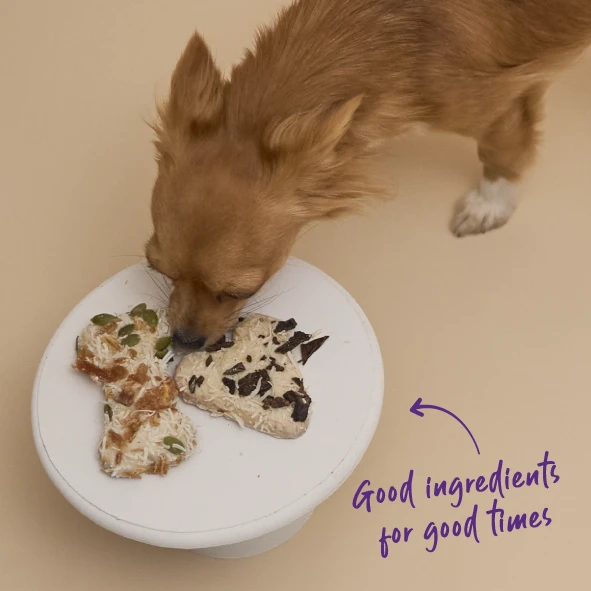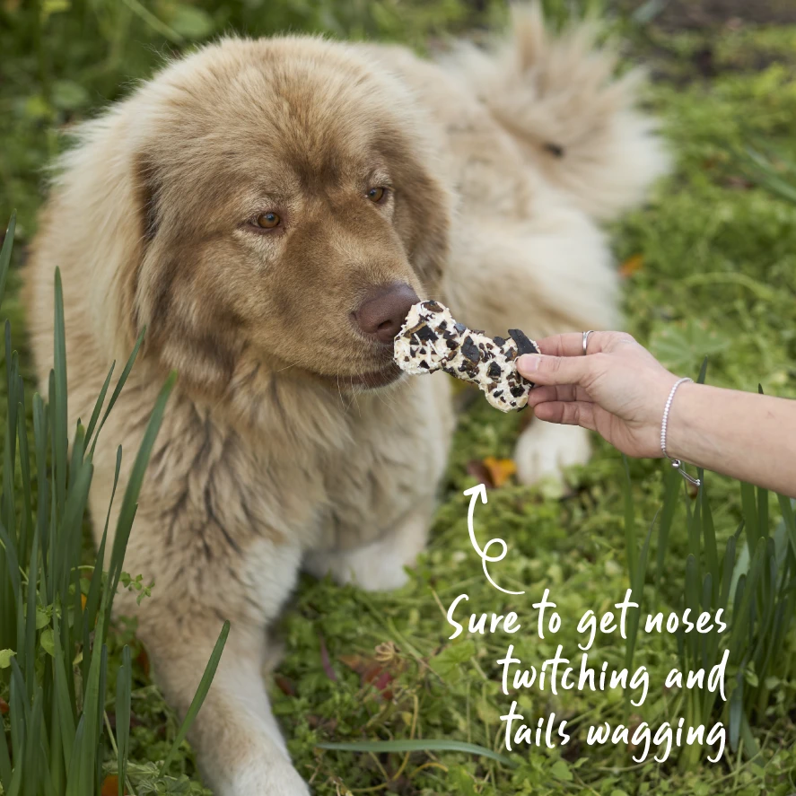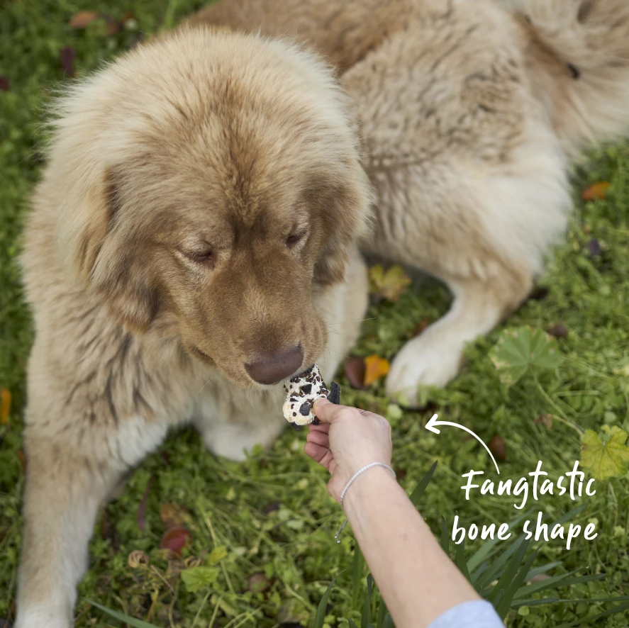 But then, as an added bone-us, they’re also moulded into these fangtastic bone shapes that your pooch will love to chew on. So don’t just give your dog a tasty treat. Give ‘em a marvellous one. A meaty marvel from Kazoo.