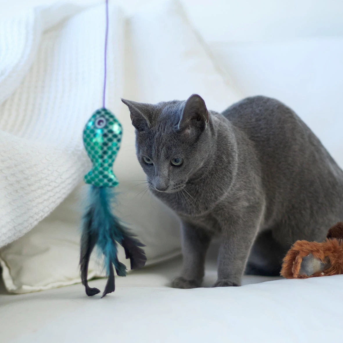 - Variety of textures with feathers to trigger primal play and hunting instincts