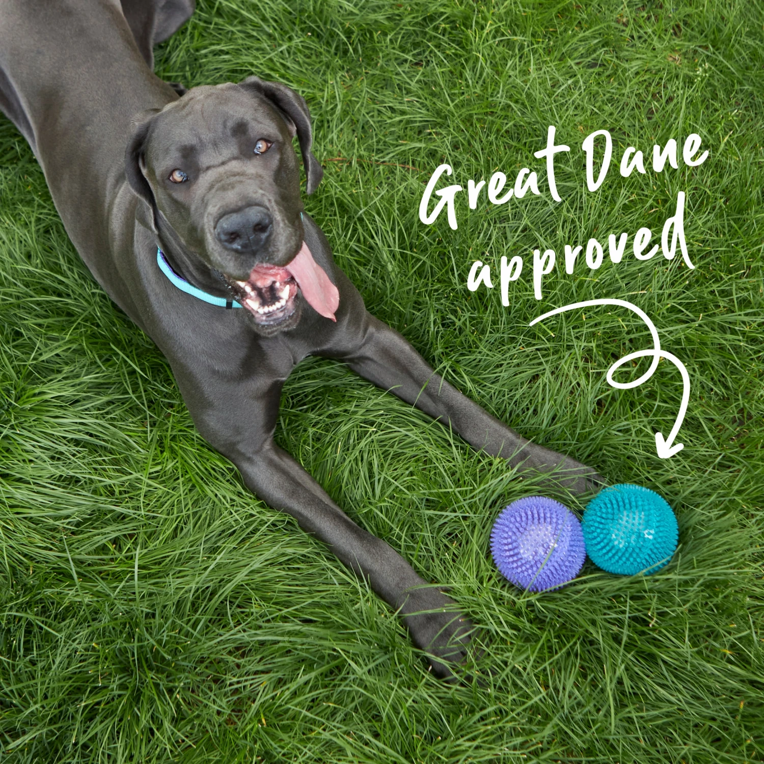 My large space ball toy is covered with rubber prongs that gently massage my gums and help clean my teeth at the same time. Although my pawrents seem to care more about my teeth staying clean that than I do… pawsonally I’m more interested in playing catch because it’s a great bounce toy, too.